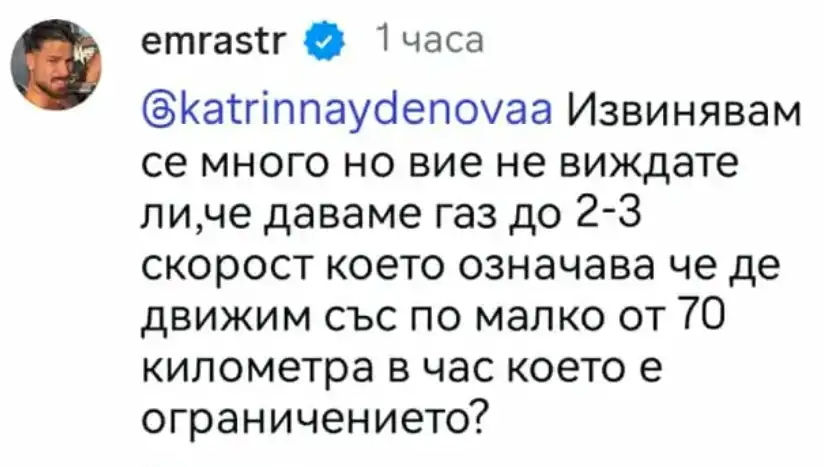 Емрах не остана безмълвен и отговори на критиките: "Извинявам се много, но вие не виждате ли, че даваме газ до 2-3 скорост, което означава, че се движим с по-малко от 70 км/ч, което е ограничението."