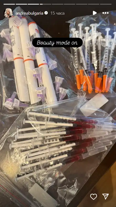 Изпълнителката наскоро качи стори в социалните мрежи с лаконичен, но многозначителен надпис: "Beauty mode ON", а на снимката ясно се виждат десетки спринцовки, някои пълни с червеникава течност – вероятно собствената ѝ кръв, използвана за популярната "вампирска терапия" (PRP – инжектиране на плазма от собствена кръв за подмладяване на кожата).