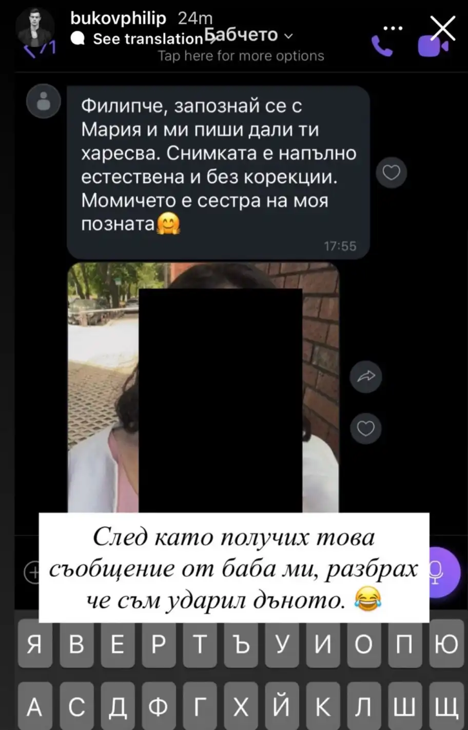 Тя дори предложила конкретна кандидатка – студентка по архитектура, сестра на нейна позната. За този симпатичен епизод разказа самият Буков, публикувайки скрийншоти от разговора им. На тях се вижда как баба му му изпраща снимка на девойката с думите: