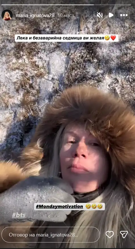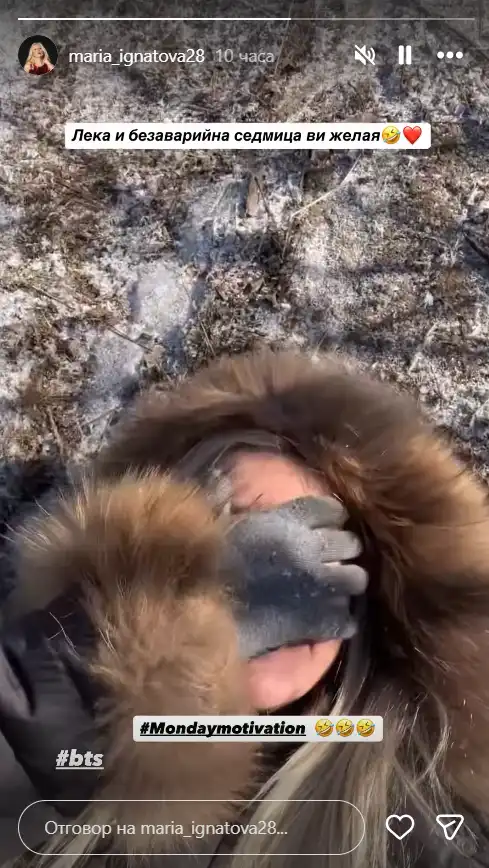 По ирония на съдбата обаче, само няколко секунди по-късно кадрите й придобиха неочакван обрат. Мария се хлъзва по заснежената планинска пътека и падна по гръб.